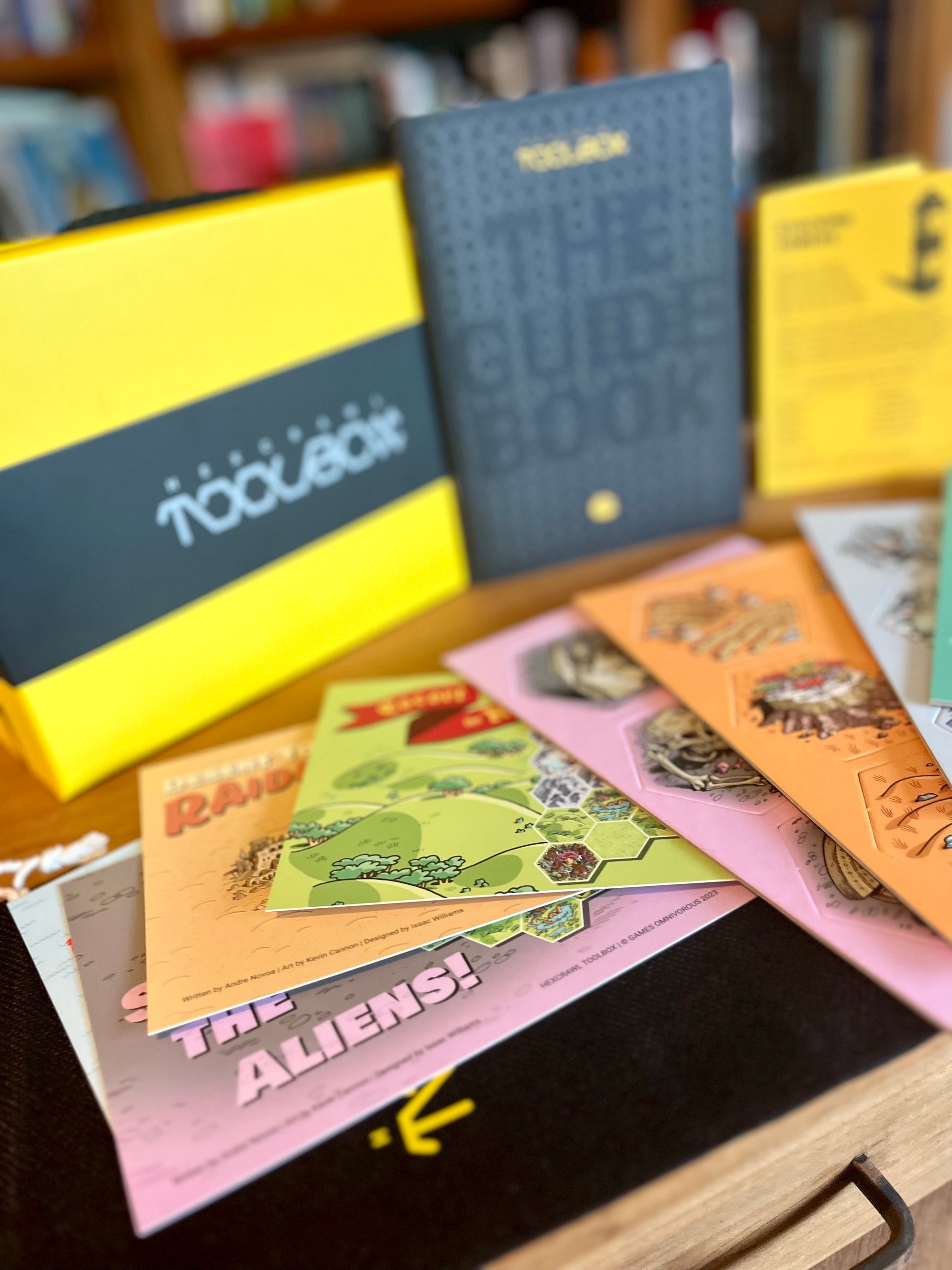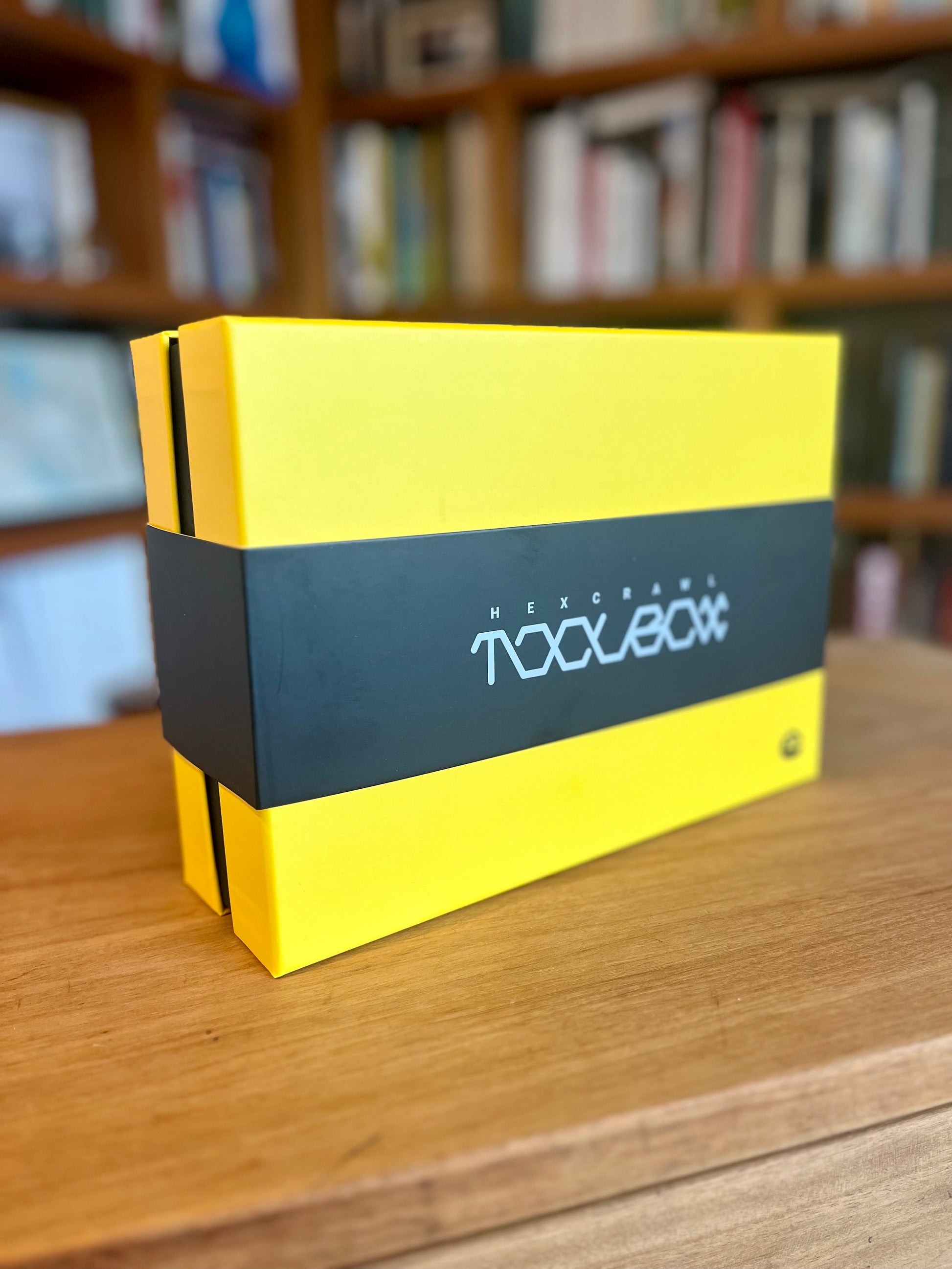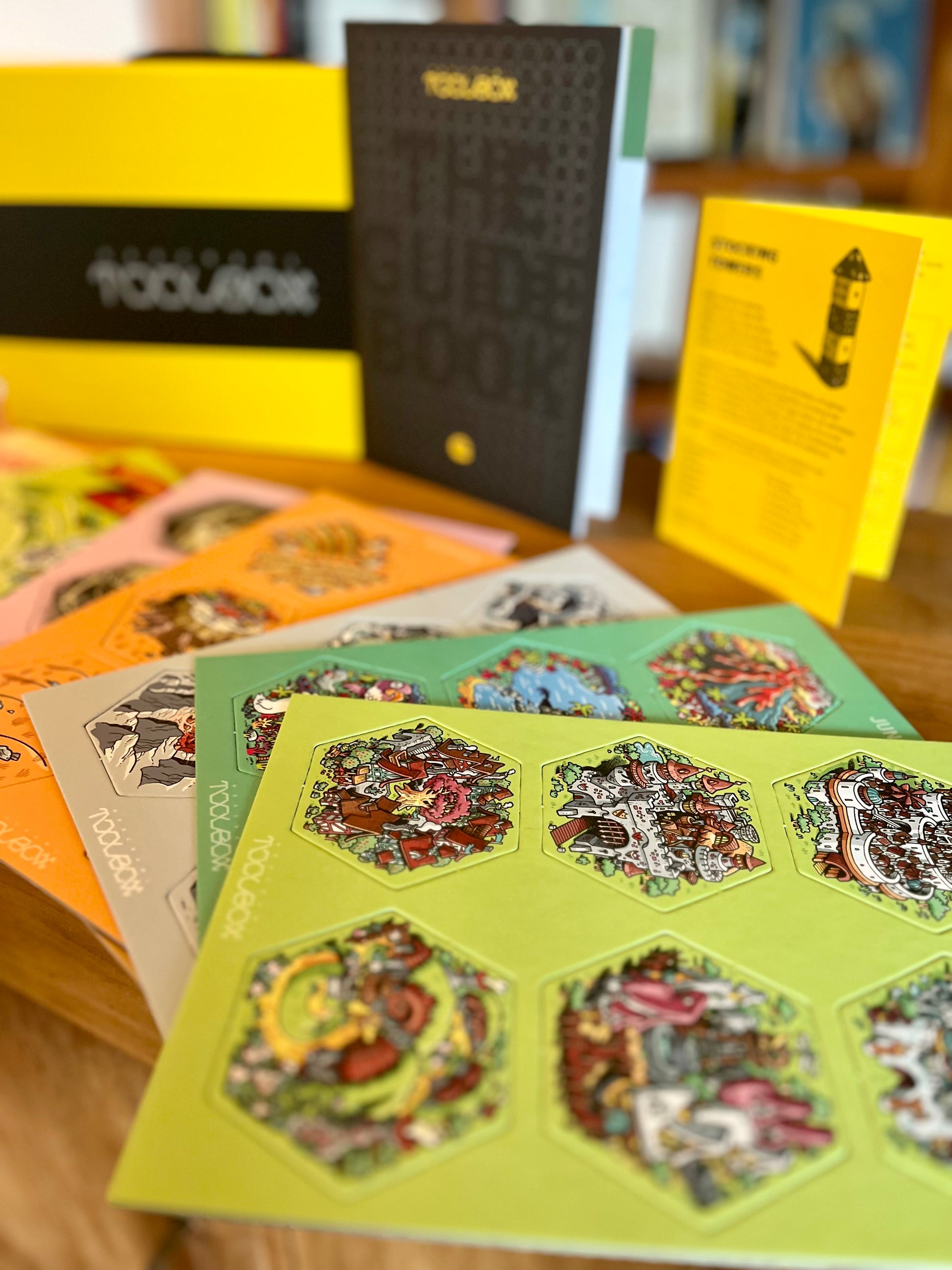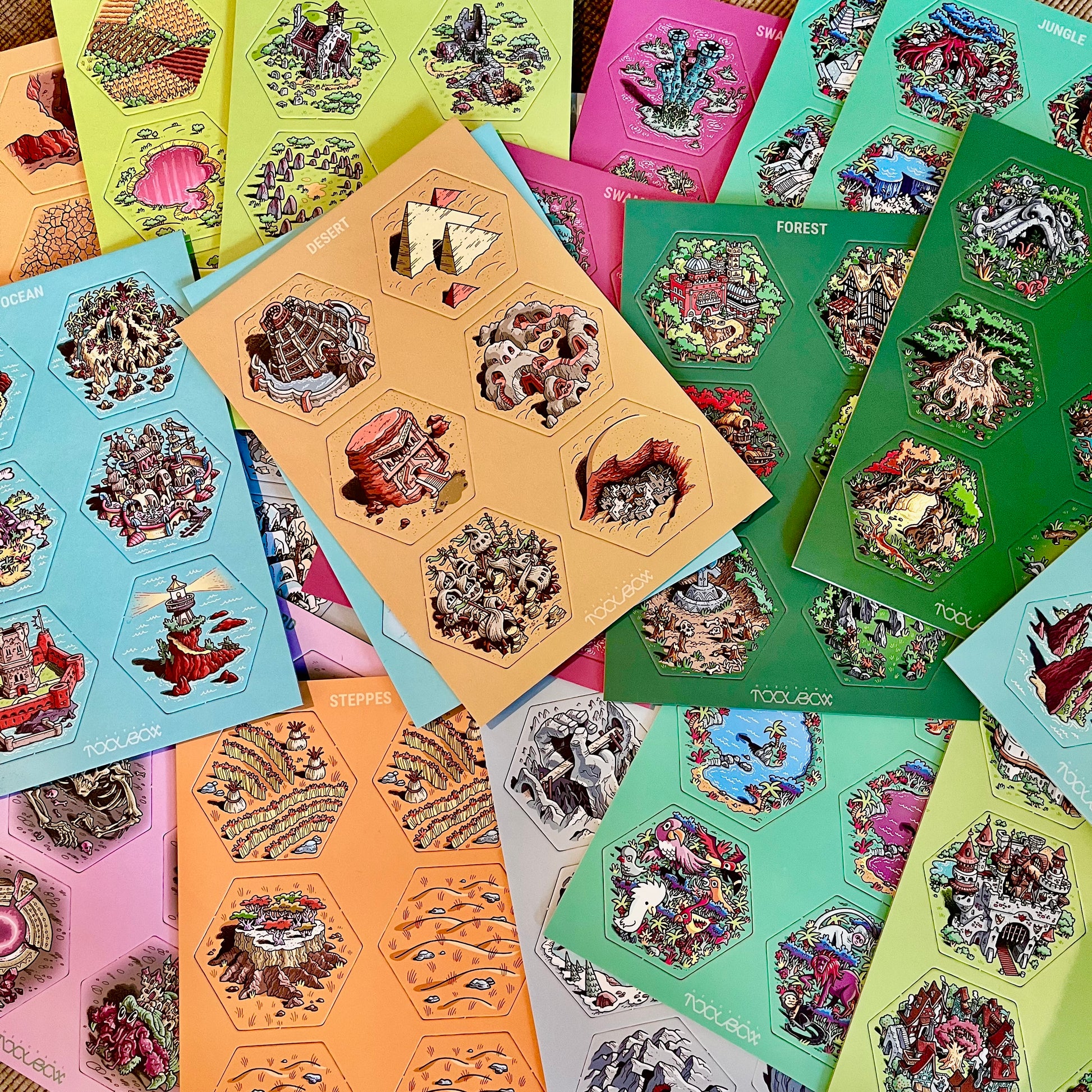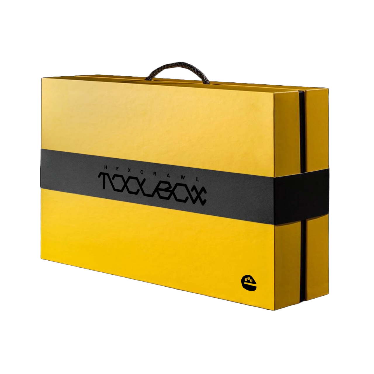 The Hexcrawl Toolbox is a deluxe worldbuilding accessory for use with fantasy roleplaying games. Contains 150 physical hex tiles for eight biomes, a guidebook on how to set up and run a hexcrawl, and a ton of fun extras for your games. Fully compatible with our Hex-n-Screen products, such as Undying Sands and Bottled Sea.
