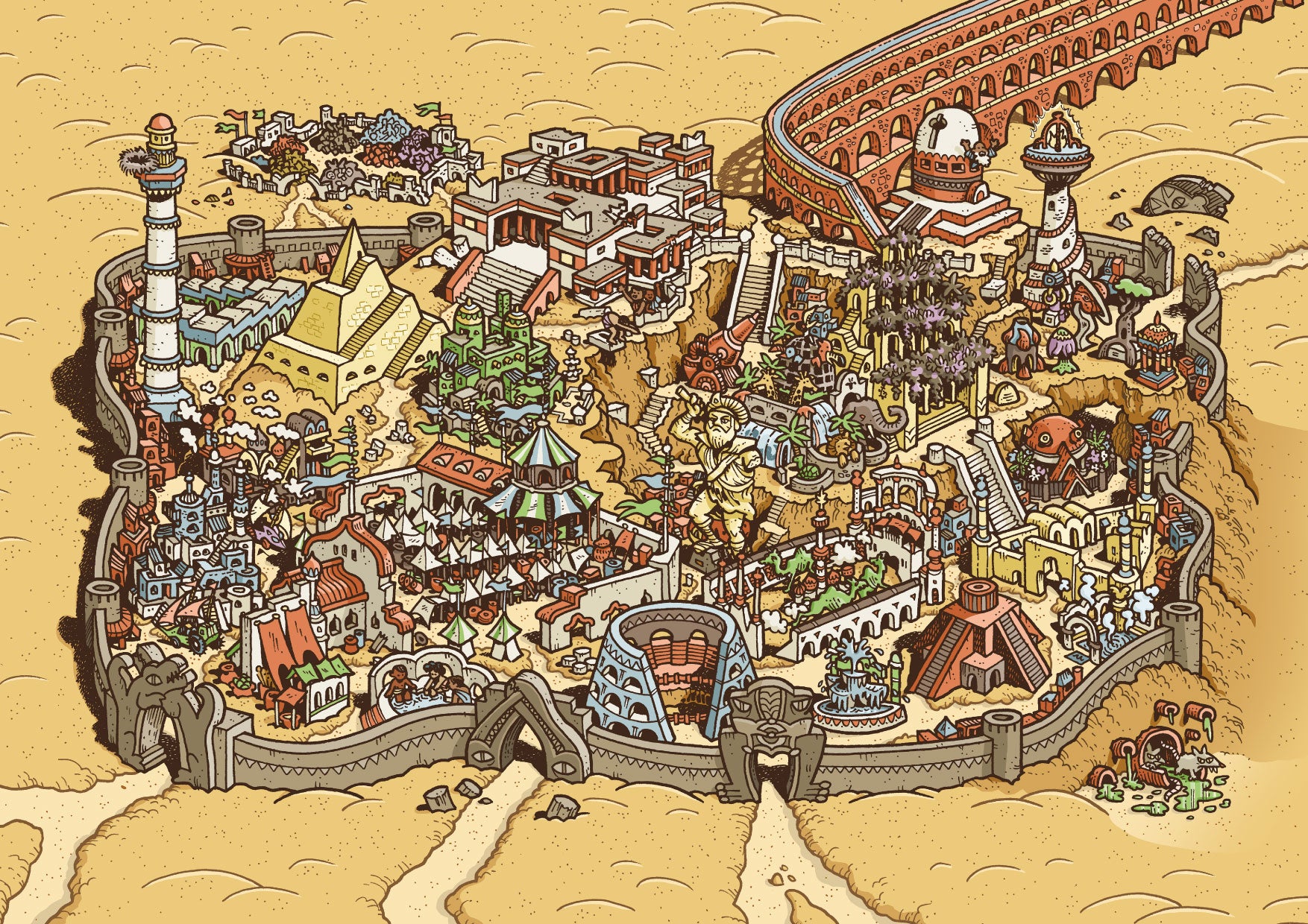 The Undying Sands is a weird desert setting in a weird format. Heavily inspired by Antiquity (Ancient Carthage, Egypt, Mesopotamia and the Greco-Roman world) and sprinkled with sci-fi elements from Mad Max and Jodorowsky’s Dune, the Undying Sands is a lost decaying civilization. Its glorious past long gone, the Sands are now a wasteland of sorts, dotted with crumbling ruins, antiquated temples, lost technology, and pristine natural wonders beyond the reach of most.