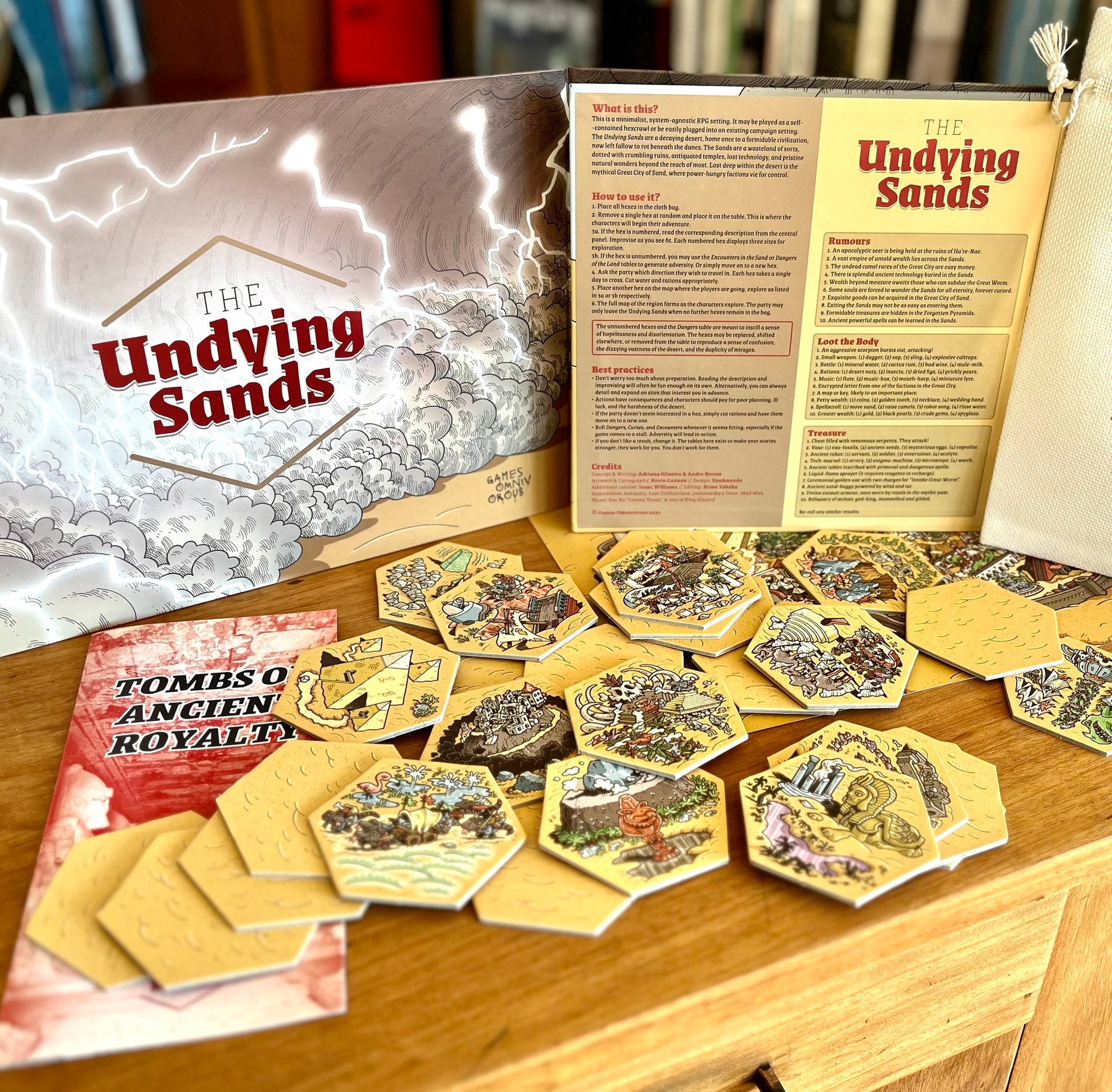 The Undying Sands is a system-agnostic RPG setting in the hex-n-screen format. Highly compatible with traditional Sword-n-Sorcery and Science Fantasy roleplaying games. Includes 30 hexes, GM screen, hand-out poster and cloth bag.