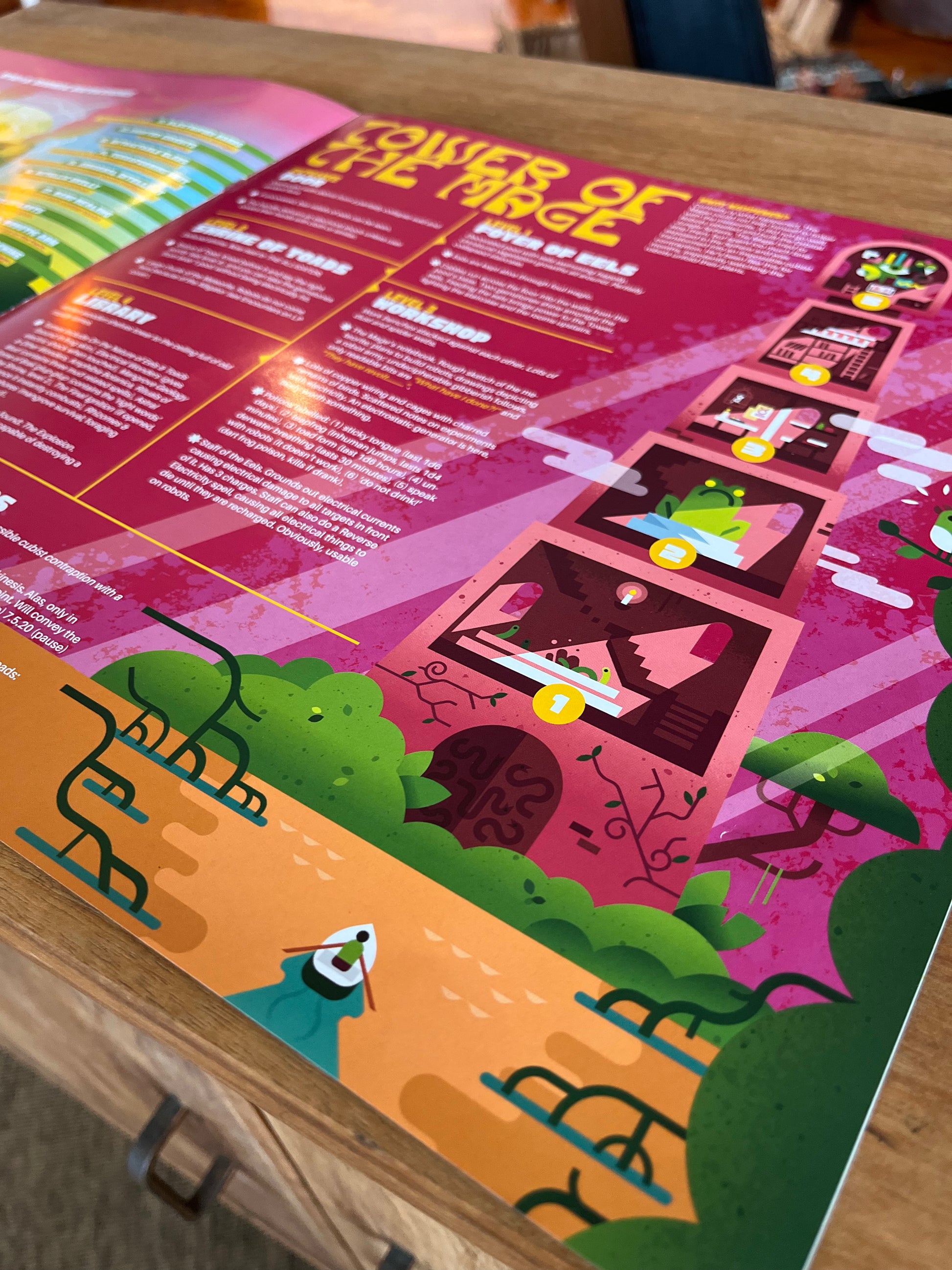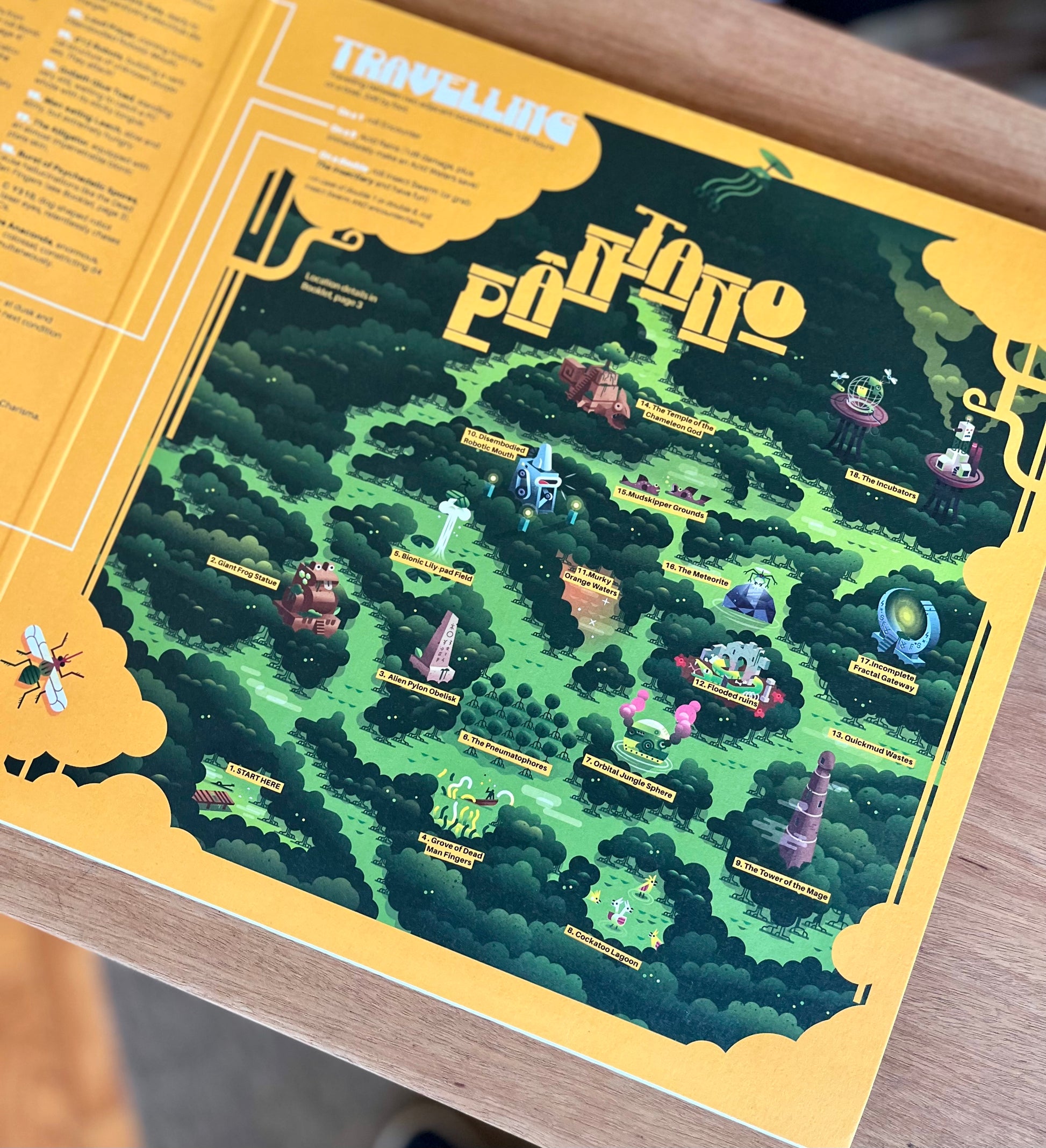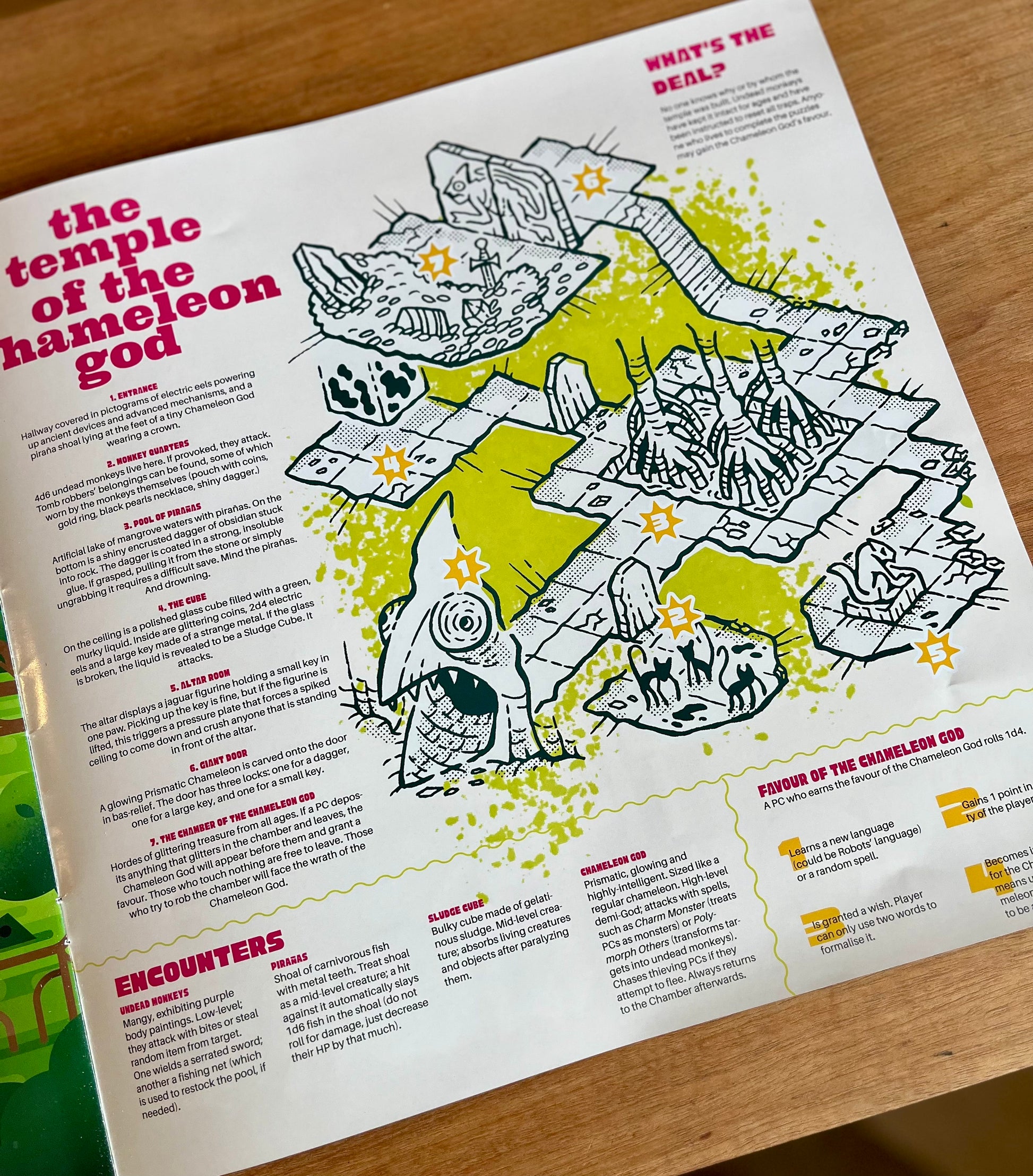 The LP gatefold doubles up as an impromptu GM screen, containing a map of the mangrove, procedures to run the setting, as well as tables for encounters, insect swarms and acid waters. Inside you will find an eight-page booklet containing detailed descriptions of the mangrove's creatures and inhabitants, its more important locations and two ready-to-play adventures/dungeons.