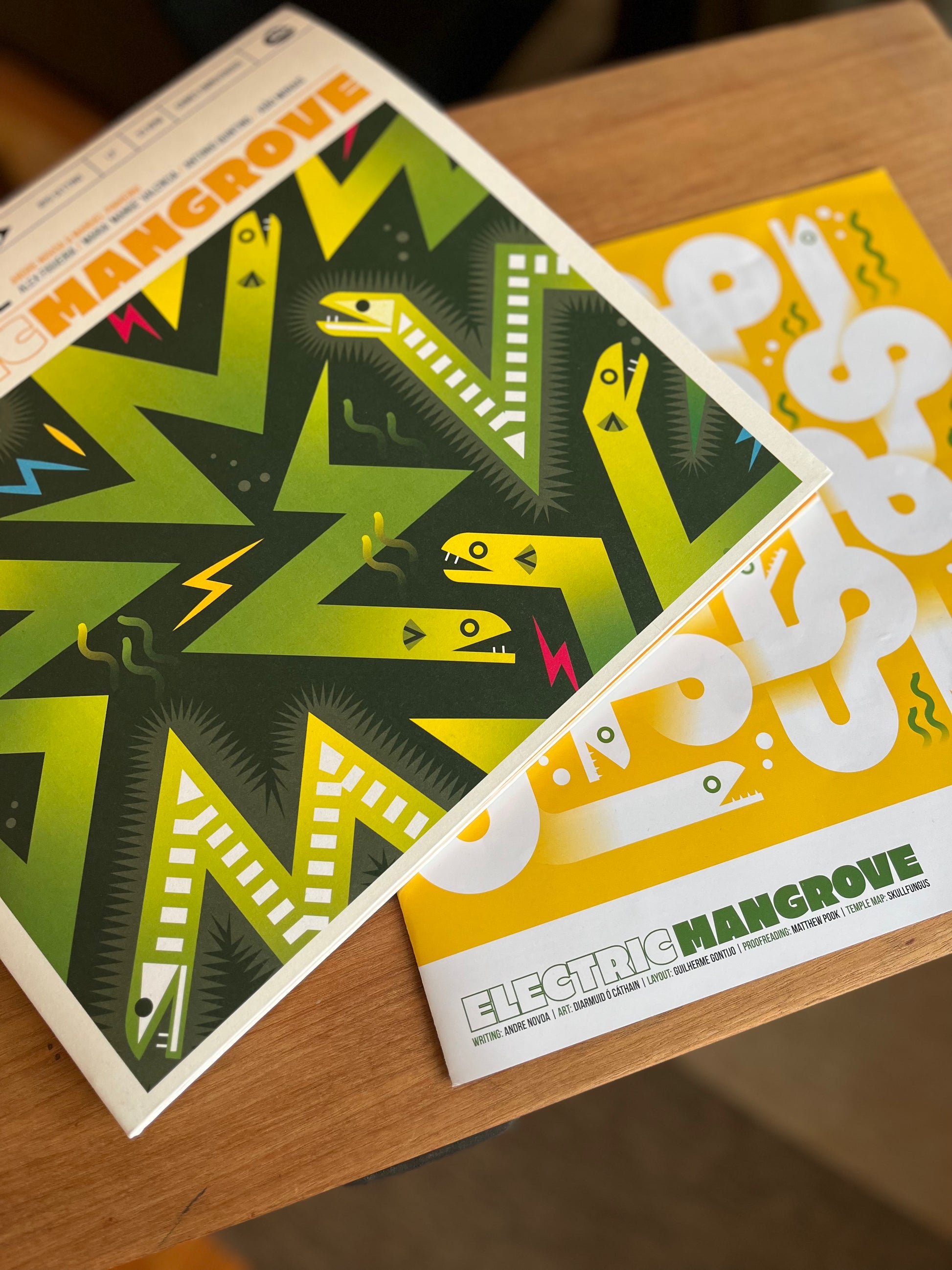 Electric Mangrove is a system-agnostic setting in LP format for use with any traditional roleplaying game. Included is a vinyl with 10 tracks, a GM screen and an eight-page booklet with ready-to-play adventures.